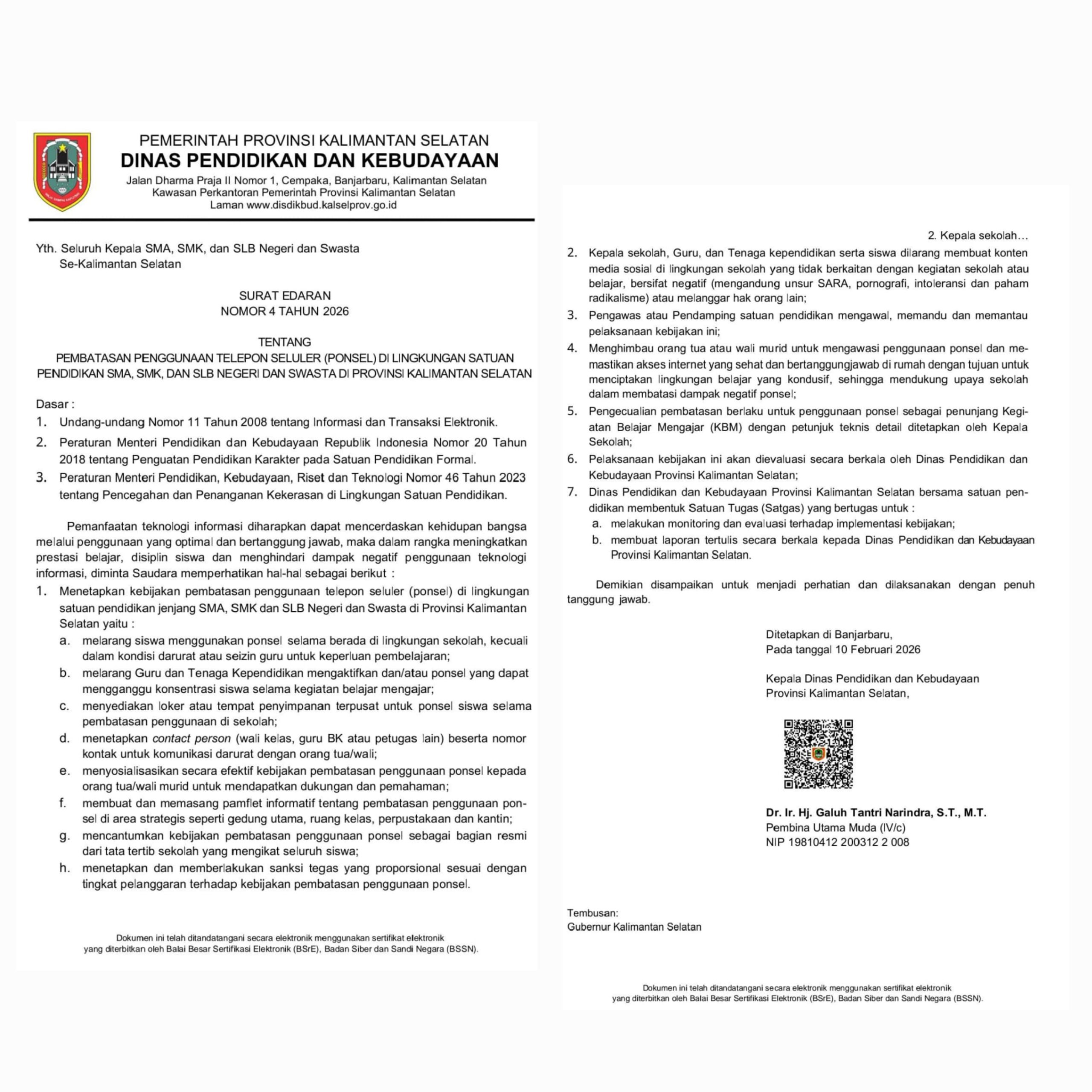 Disdikbud Provinsi Kalimantan Selatan Terbitkan Surat Edaran Pembatasan Penggunaan Handphone di Sekolah